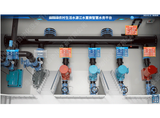 其次,孿生系統(tǒng)基于整個農(nóng)村供水場景的數(shù)字化以及三維化設(shè)計并實現(xiàn)了科學、合理、易用的用戶UI系統(tǒng)。用戶通過UI系統(tǒng)實際使用數(shù)字孿生系統(tǒng),該系統(tǒng)的初始界面為整個農(nóng)村水廠供水的整體實時數(shù)據(jù)、預警信息以及視頻監(jiān)控等信息在三維場景下的展示。用戶通過預警信息可以輕松掌握關(guān)鍵設(shè)備運行異常問題、消毒不及時問題、末端水質(zhì)不達標問題以及供水效率問題。從而真正做到高效科學供水,有效避免不必要的人員財產(chǎn)損失。用戶可以通過用戶UI系統(tǒng)兩側(cè)控制開關(guān)收放上層信息展示。以便于更容易更清晰地查看整個農(nóng)村水廠供水的三維場景。